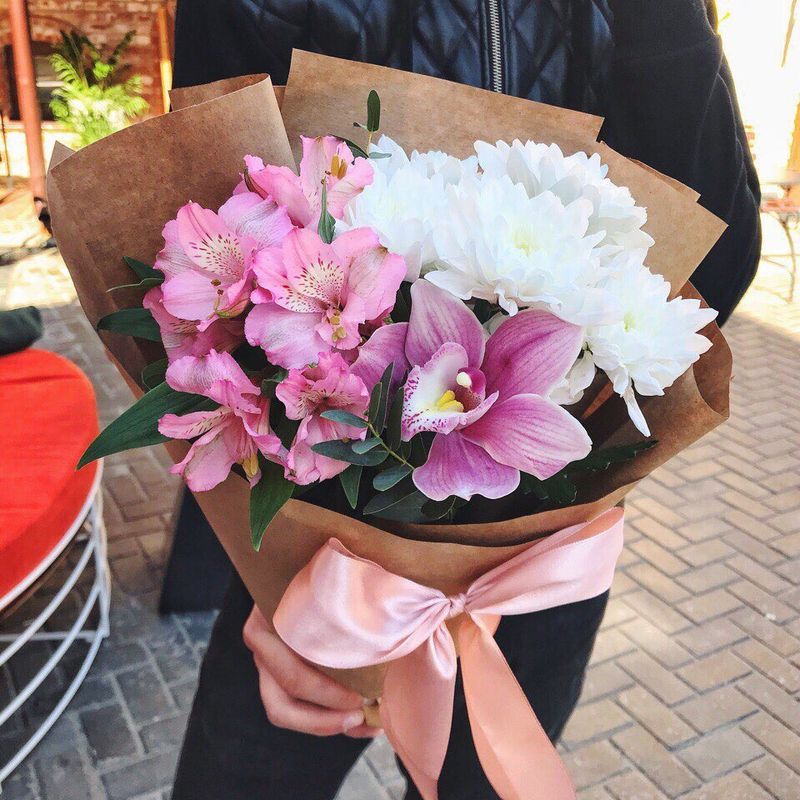 | Состав: | Упаковка , Ленты , Хризантемы , Альстромерии , Орхидея |